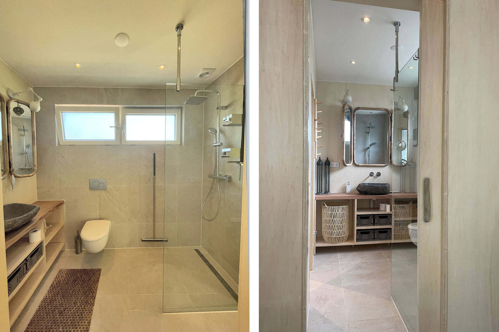 Im Erdgeschoss mit schönem Holzboden erwartet Sie ein gemütliches Wohnzimmer mit moderner Couch, Sessel und einem stimmungsvollen Holzkaminofen. Das Interieur ist mit viel Liebe im warmen Ibiza-Stil eingerichtet: natürliche Materialien, erdige Töne und entspannte Details, die sofort Urlaubsgefühle wecken. Perfekt für einen gemütlichen Abend mit einem guten Buch oder einem Film auf dem Flachbildschirm mit Kabelanschluss.