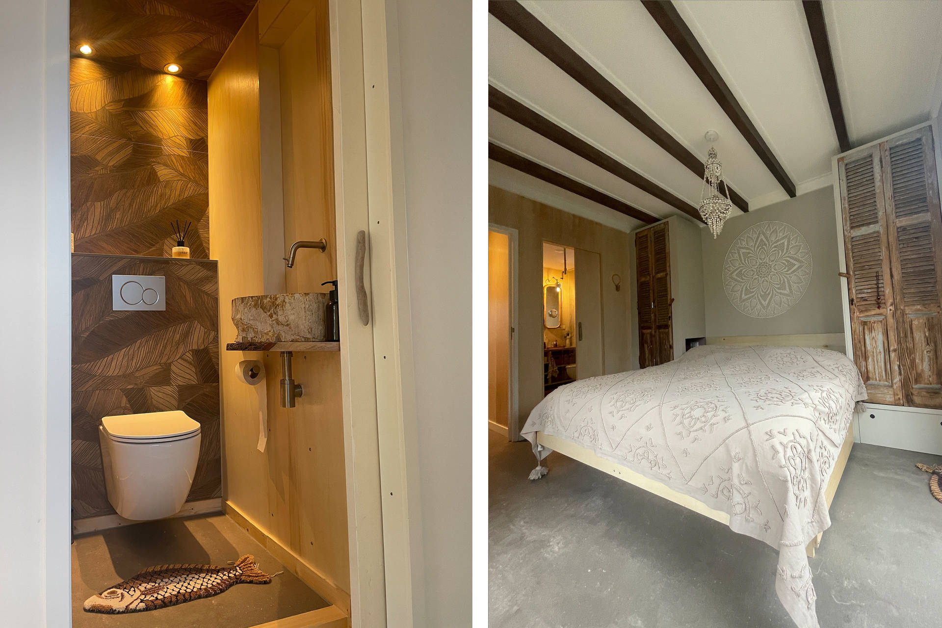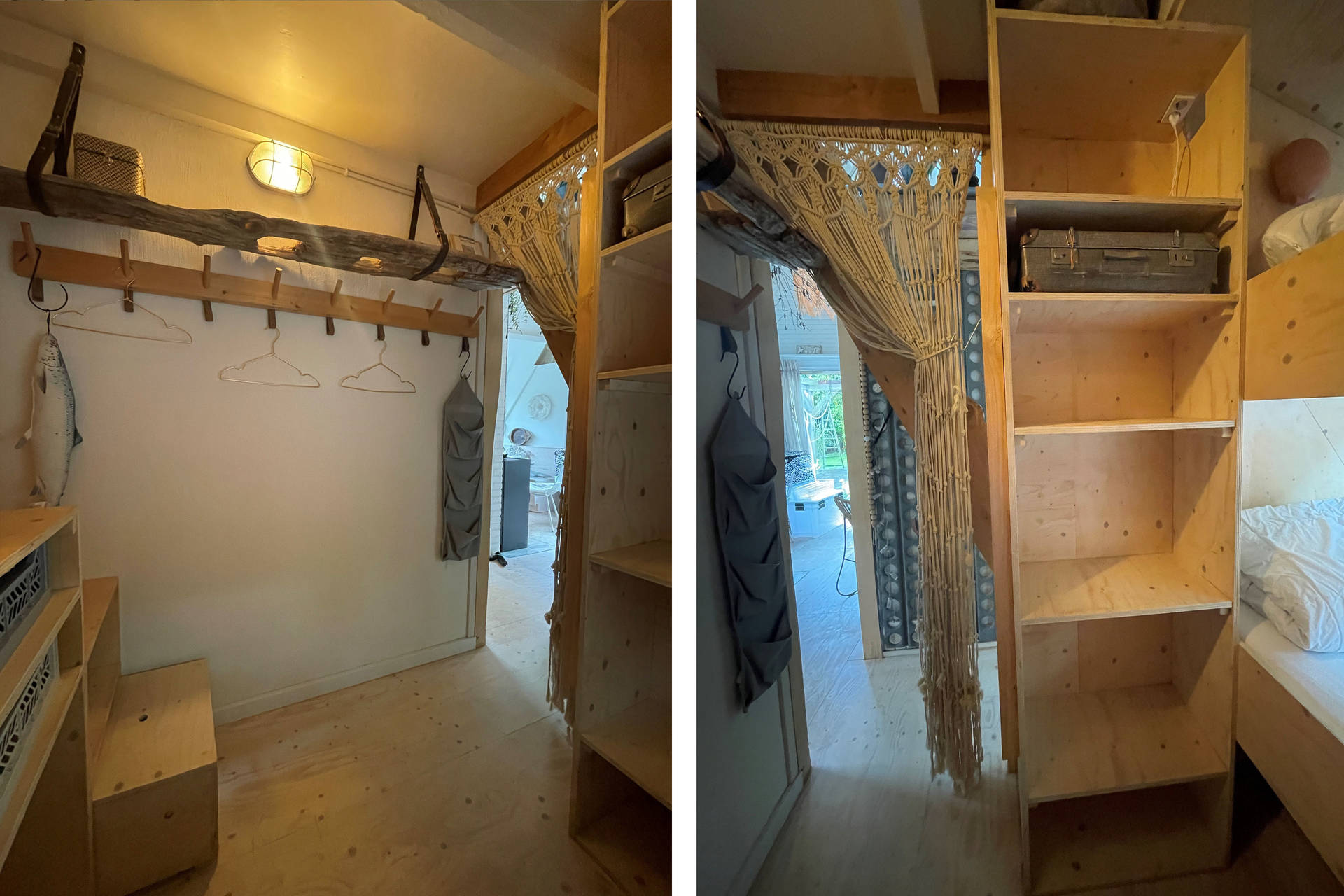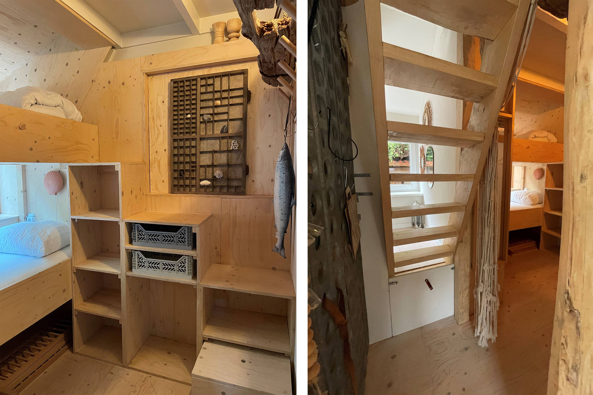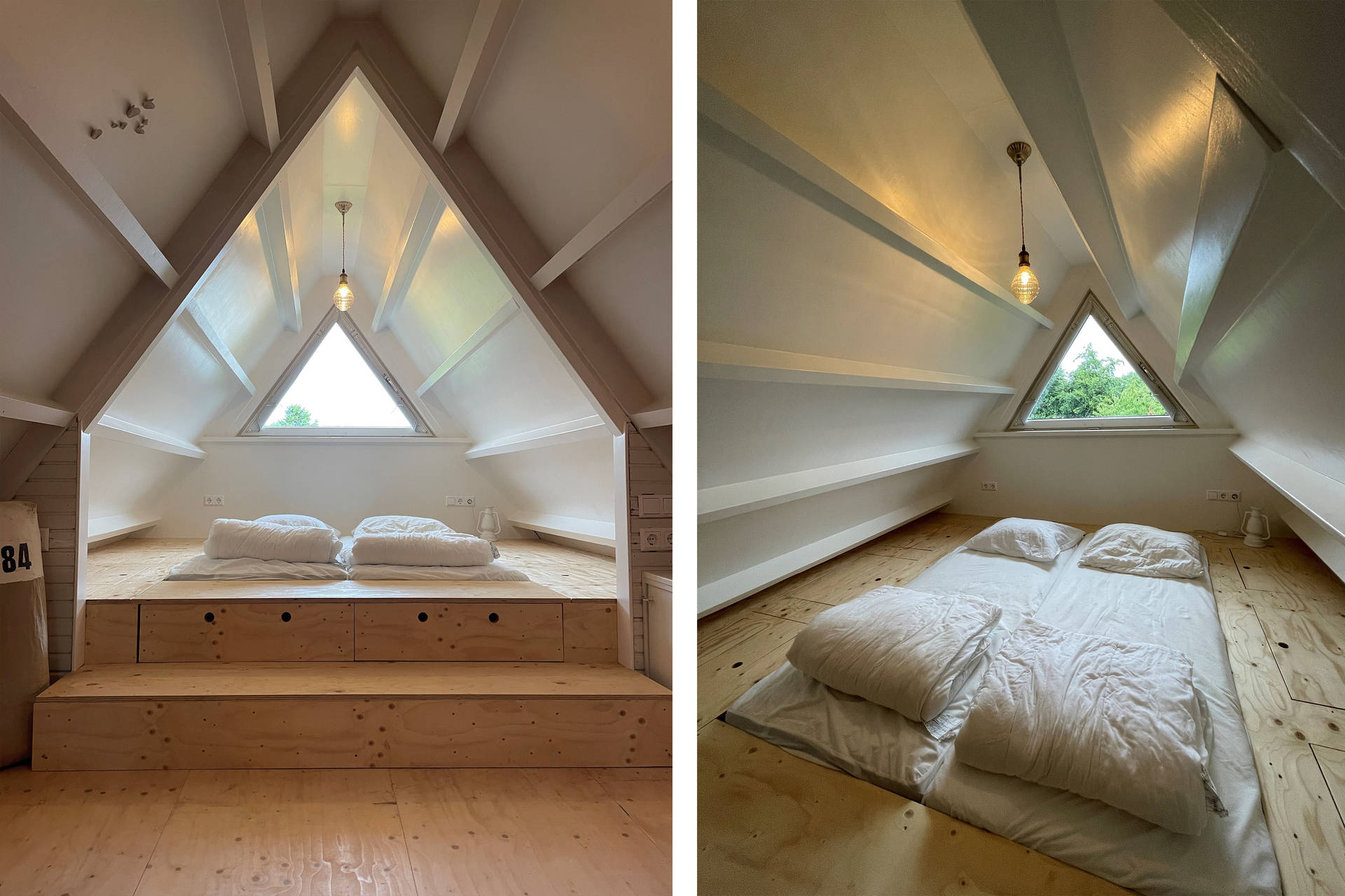 Im Erdgeschoss befinden sich zwei Schlafzimmer. Das geräumige Schlafzimmer hat ein Doppelbett (1,80 × 2,00 m) und direkten Zugang zum Badezimmer mit Dusche und WC. Das zweite, kleinere Schlafzimmer ist mit einem Etagenbett ausgestattet, ideal für Kinder. Im Flur befindet sich eine separate zweite Toilette. Über eine relativ steile Treppe erreichen Sie das Obergeschoss mit dem dritten Schlafzimmer und einem in den Boden eingelassenen Doppelbett.