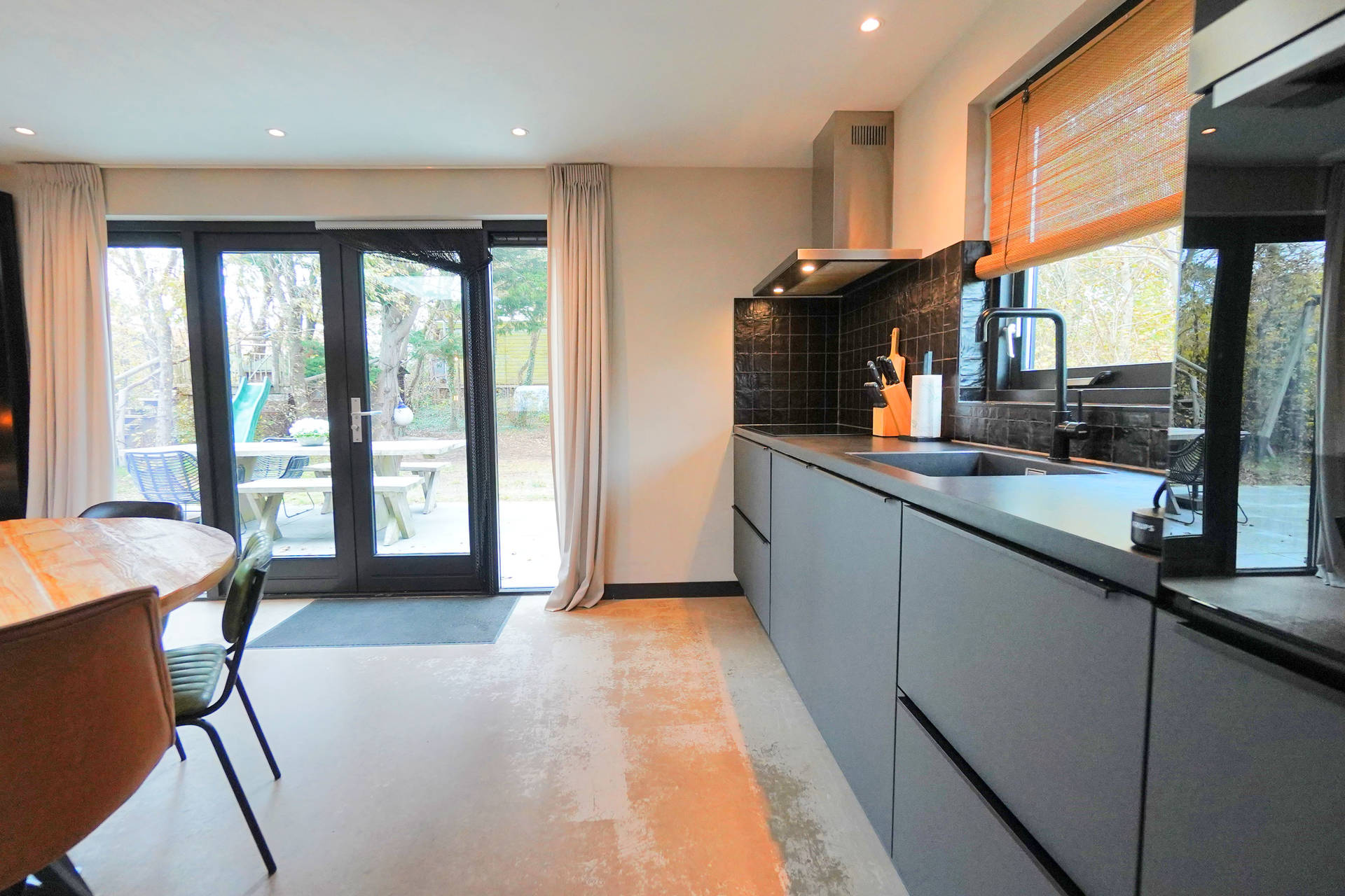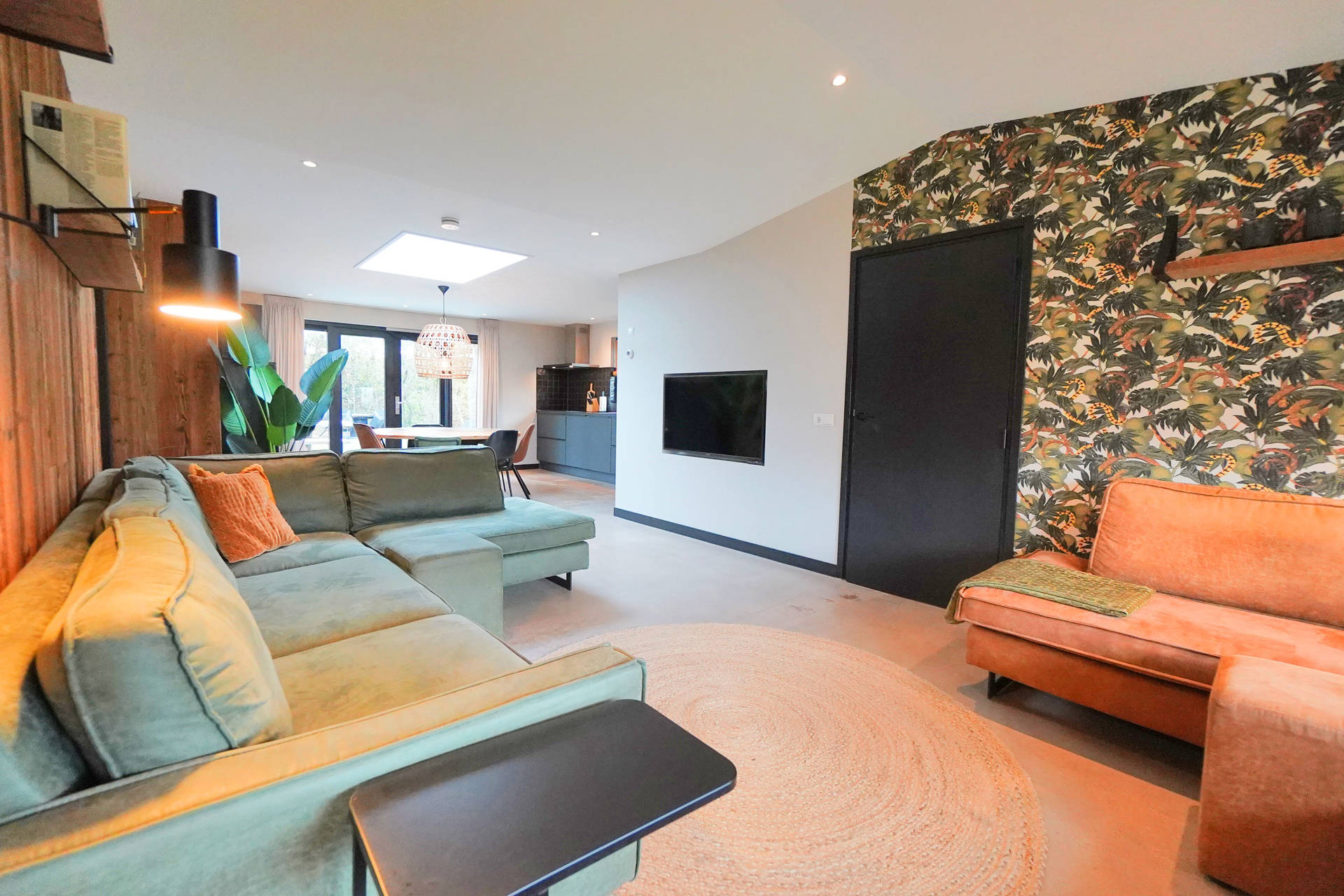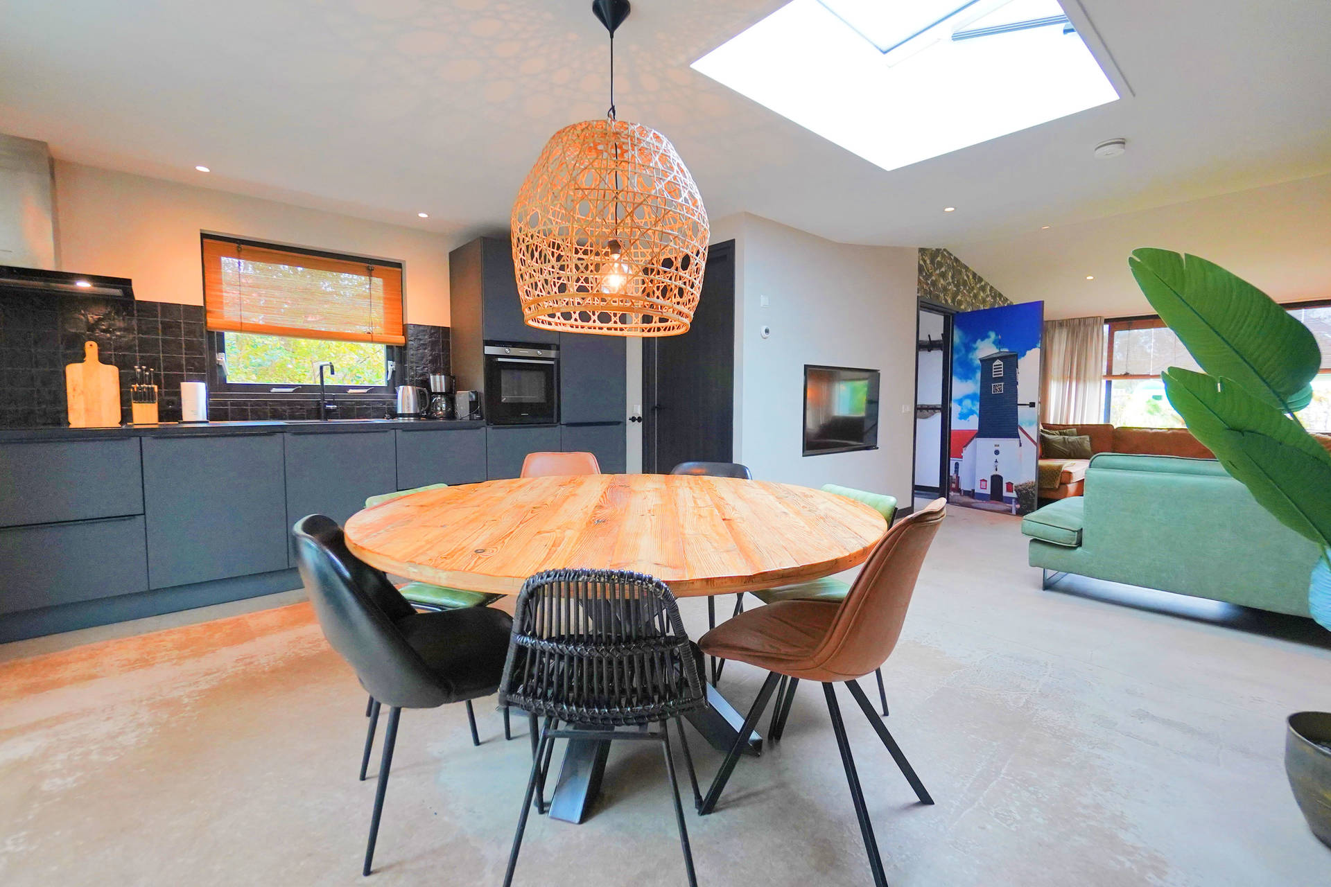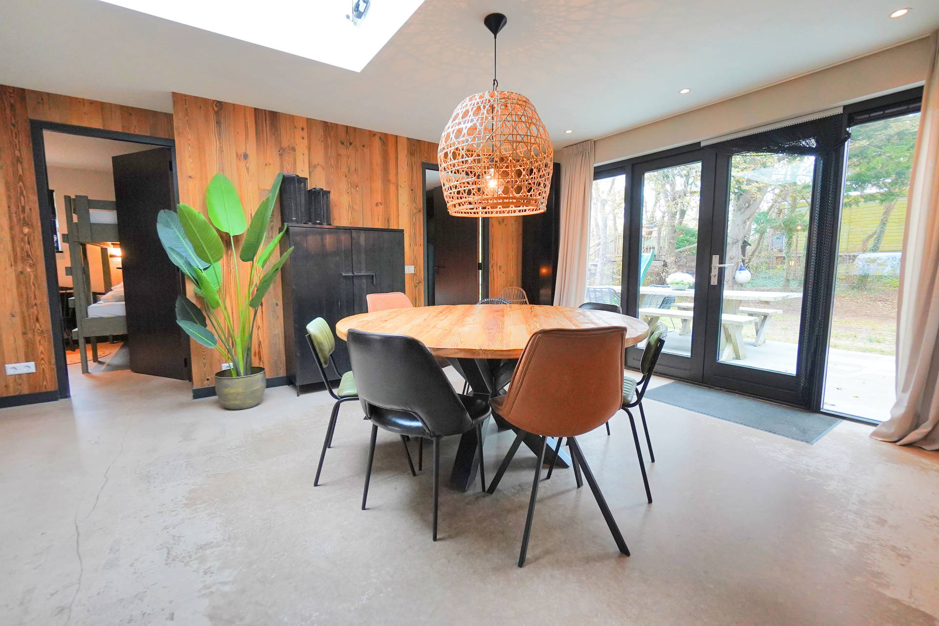 Das Haus ist komplett ebenerdig und mit viel Liebe zum Detail eingerichtet. Im Wohnzimmer finden Sie einen großen Esstisch, eine gemütliche Sitzecke und viel Licht dank der Terrassentüren zum Garten.