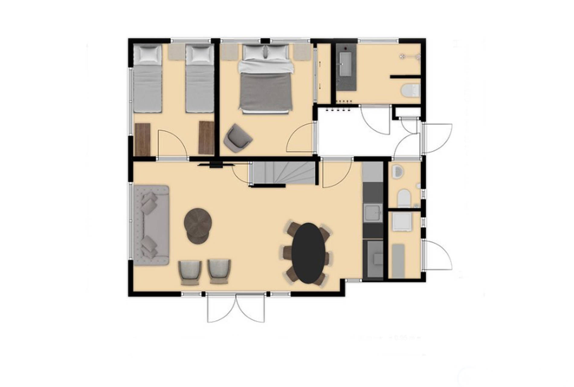 Die Schlafzimmer haben jeweils 2 Einzelbetten. Das Badezimmer hat eine begehbare Regendusche, Waschbecken und Toilette. Es gibt auch eine separate Toilette in der Diele. Im Abstellraum, der von außen zugänglich ist, finden Sie eine Waschmaschine und einen Trockner.