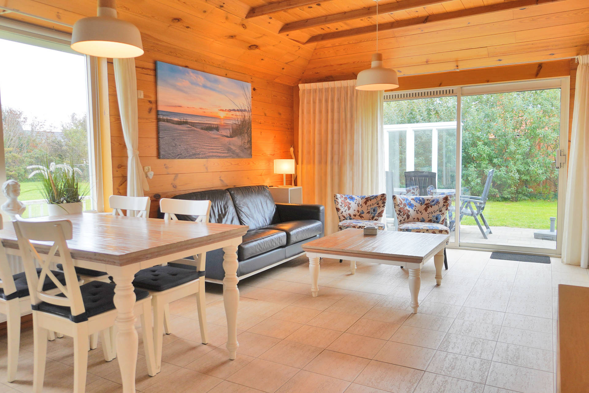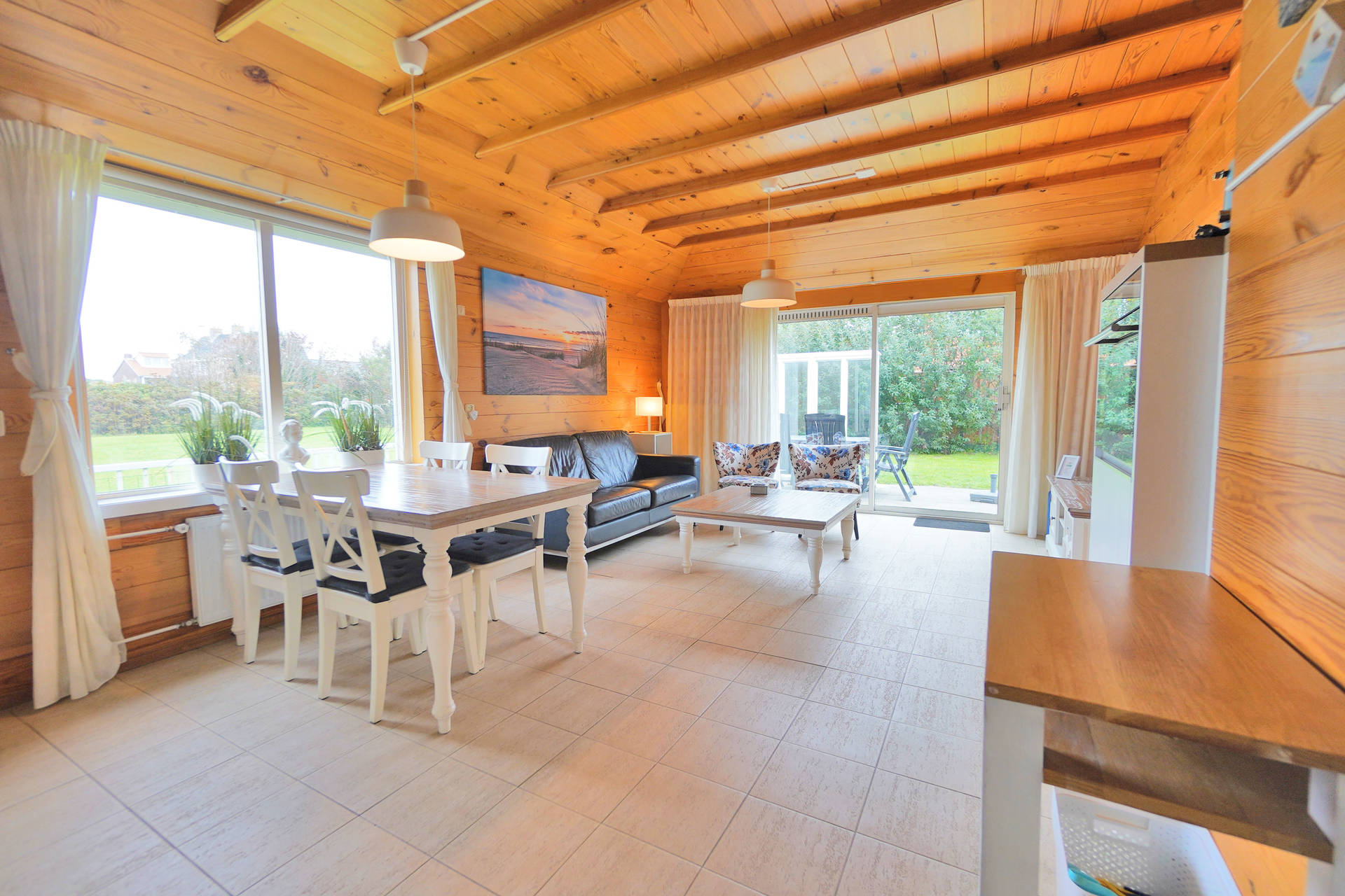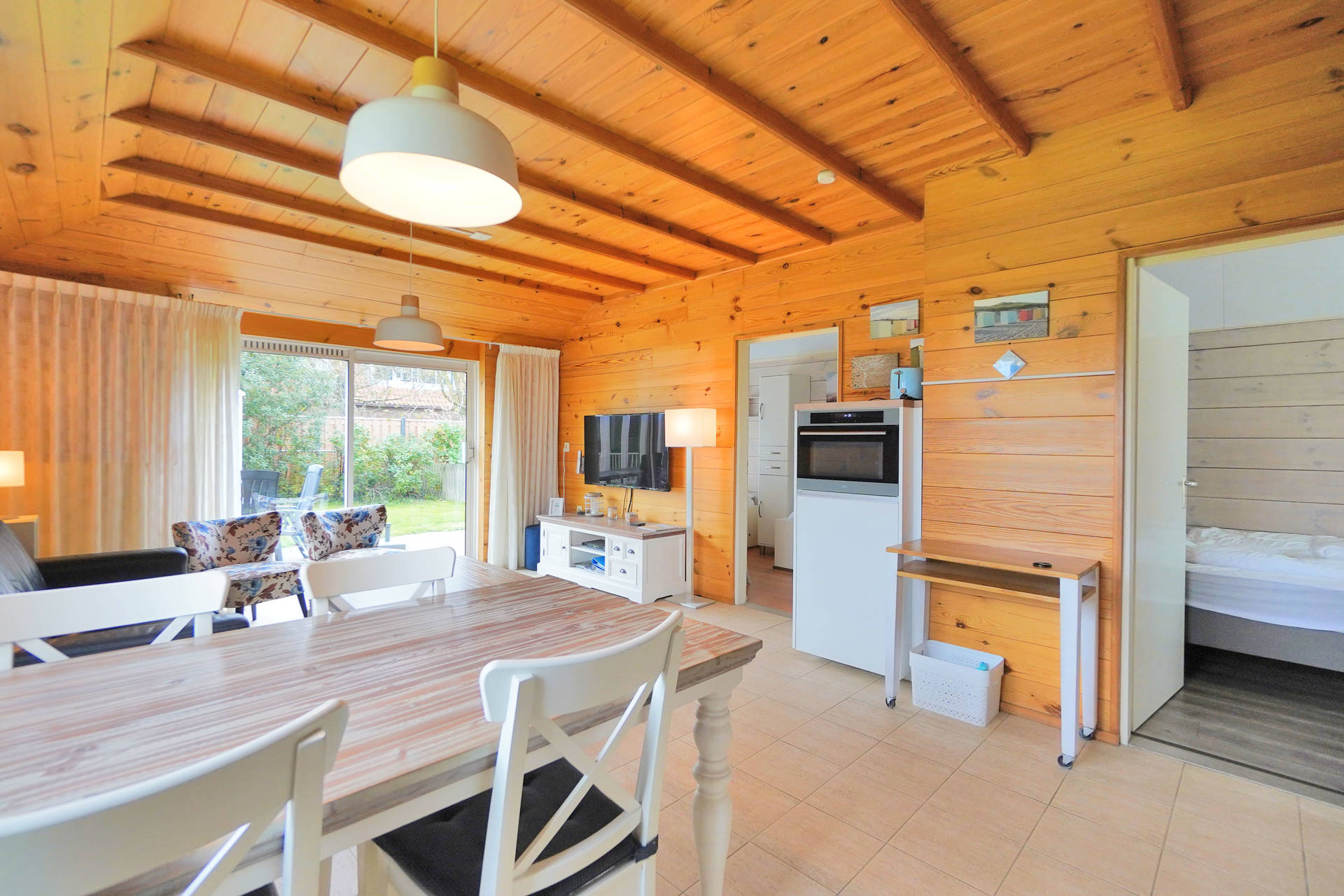 Alle Zimmer des gemütlichen Ferienhauses, das komplett aus Holz gebaut ist, sind im Erdgeschoss. Es gibt eine gut ausgestattete, offene Küche im Wohnzimmer, einen Essbereich mit schöner Aussicht und einen Loungebereich.