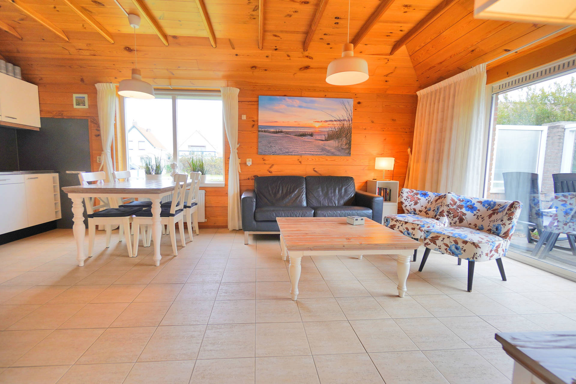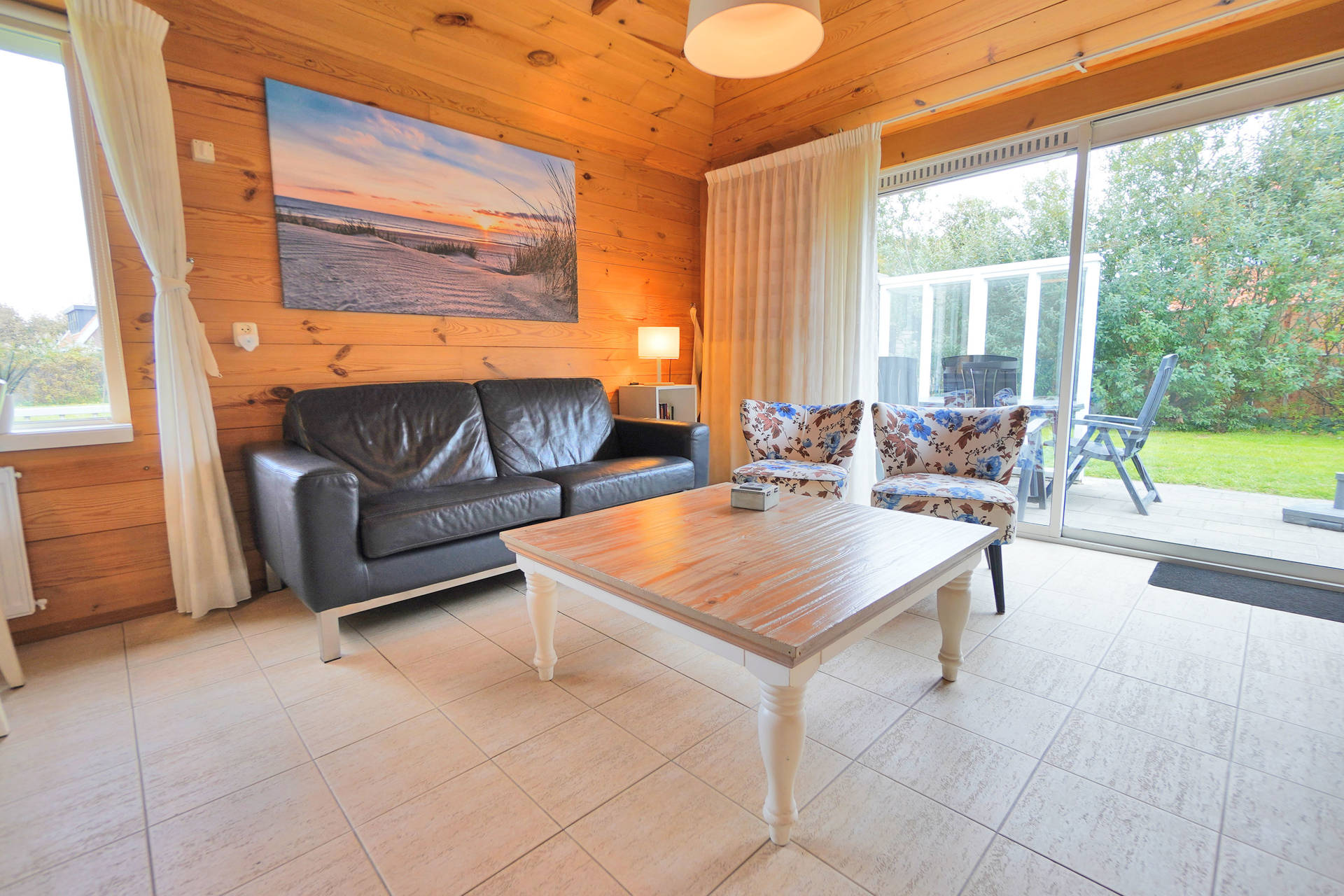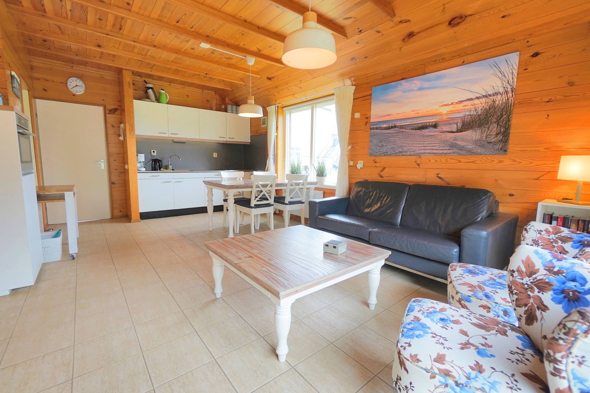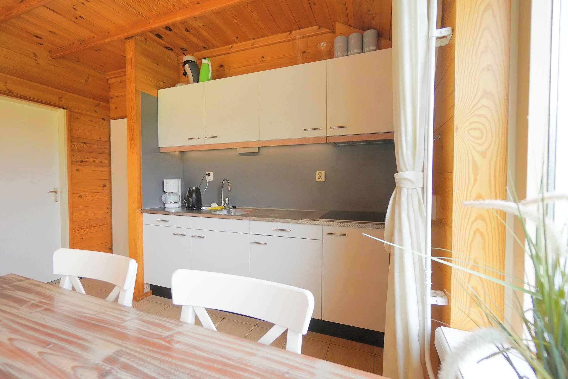 Alle Zimmer des gemütlichen Ferienhauses, das komplett aus Holz gebaut ist, sind im Erdgeschoss. Es gibt eine gut ausgestattete, offene Küche im Wohnzimmer, einen Essbereich mit schöner Aussicht und einen Loungebereich.