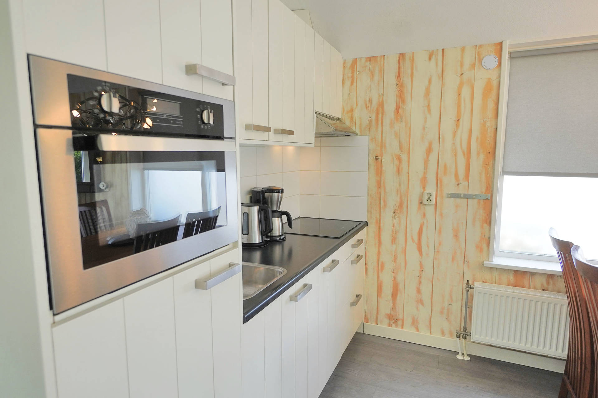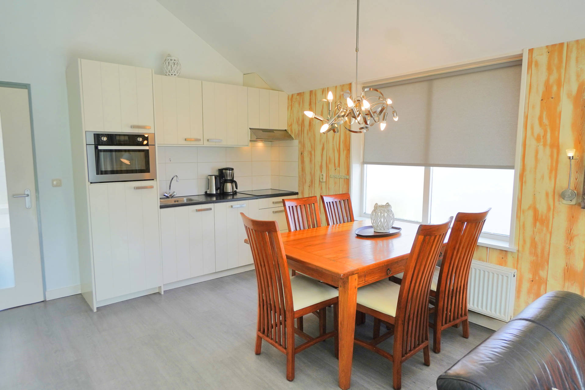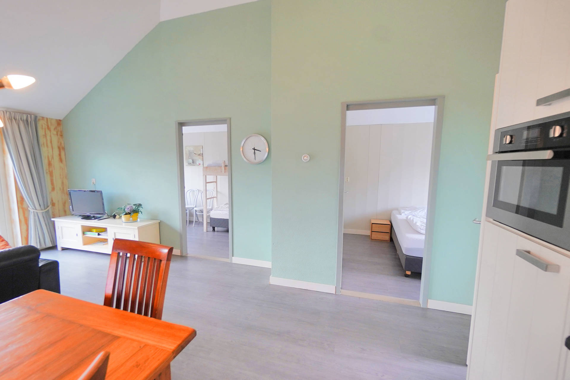 Sie betreten das Haus durch einen kleinen Flur, von dem aus sie ins Badezimmer und den Wohnbereich mit der offenen Küche gelangen. Das Wohnzimmer ist modern und liebevoll mit zwei Sofas und einem Esstisch eingerichtet. Die offene Küche verfügt unter anderem über einen Geschirrspüler, einen Kühlschrank mit Gefrierfach, Mikrowelle, Ofen und Herd mit Induktionsfeld.