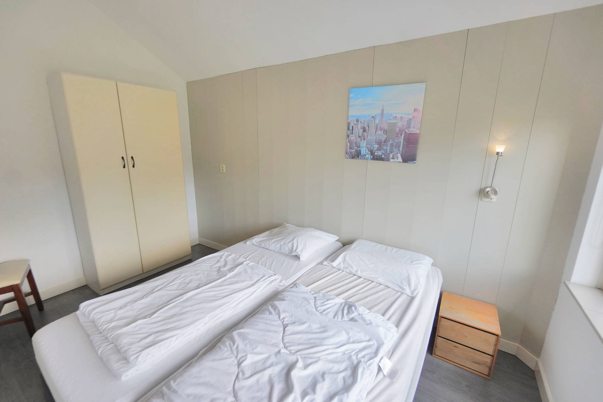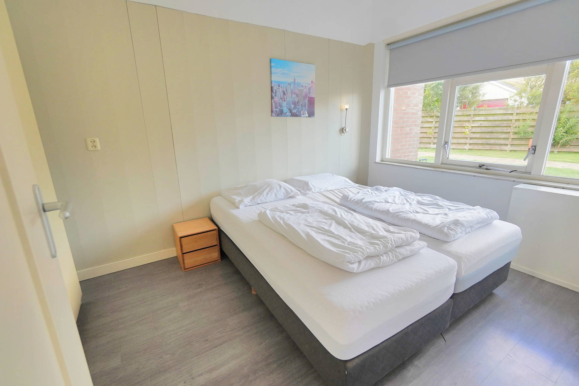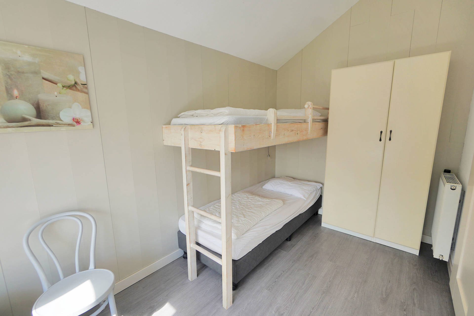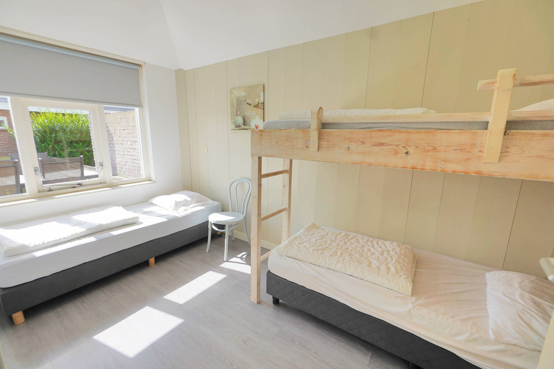 Das Ferienhaus Seinpost 7 verfügt über 2 Schlafzimmer. Ein Schlafzimmer ist mit zwei einzelnen Boxspringbetten ausgestattet und im zweiten Schlafzimmer steht ein einzelnes Boxspringbett und ein Hochbett. Alle Betten sind mit einzelnen Matratzen und Bettdecken bezogen. Das Badezimmer bietet eine Dusche, Waschbecken und Toilette.